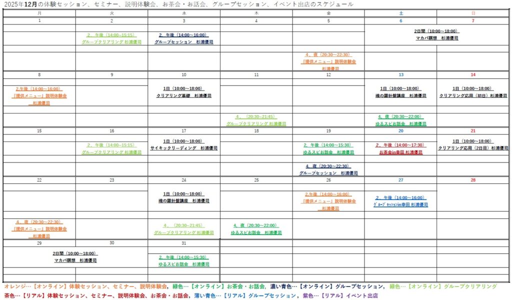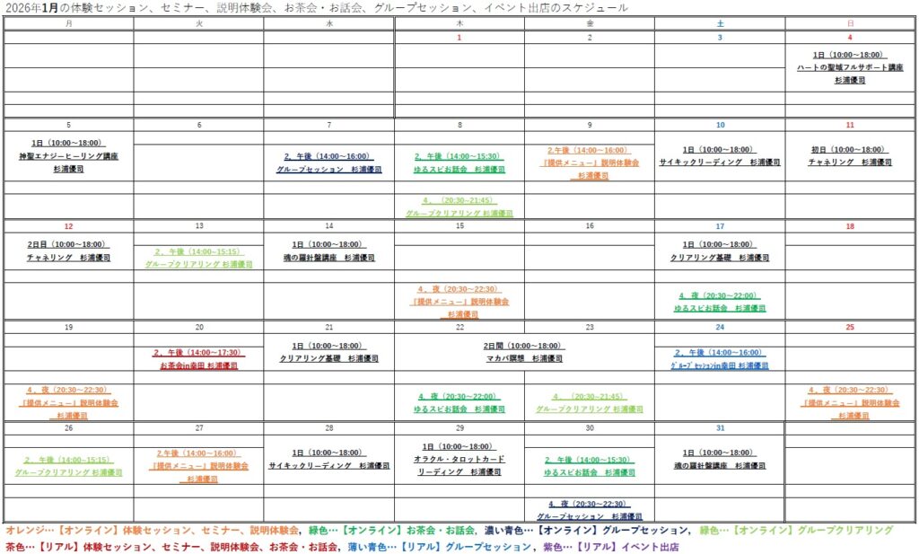 月別の体験セッション、セミナー&講座開催、説明体験会、お茶会・お話会、グループクリアリング&グループセッション、イベント出店のスケジュールの開催情報の確認と、申し込みができます。