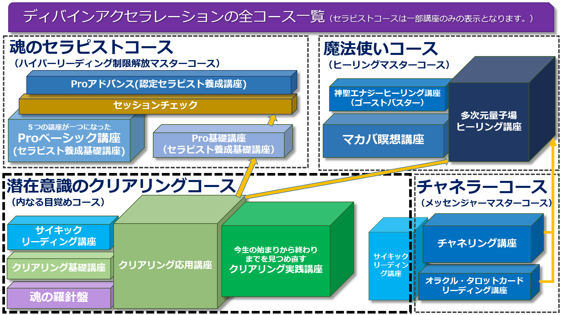 5つの講座(『魂の羅針盤講座』、『クリアリング基礎講座』、『リーディング基礎講座』、『クリアリング応用講座』、『Pro基礎講座』)が一つになった『Proベーシック』から始めて行く流れです。
