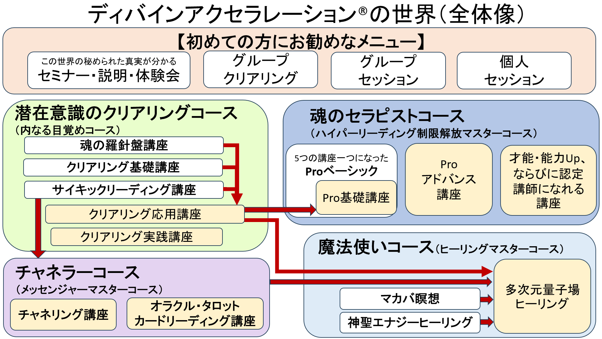 最もお勧めなのは、『魂の羅針盤講座』、『クリアリング基礎講座』、『リーディング基礎講座』のいずれかから始める流れです。