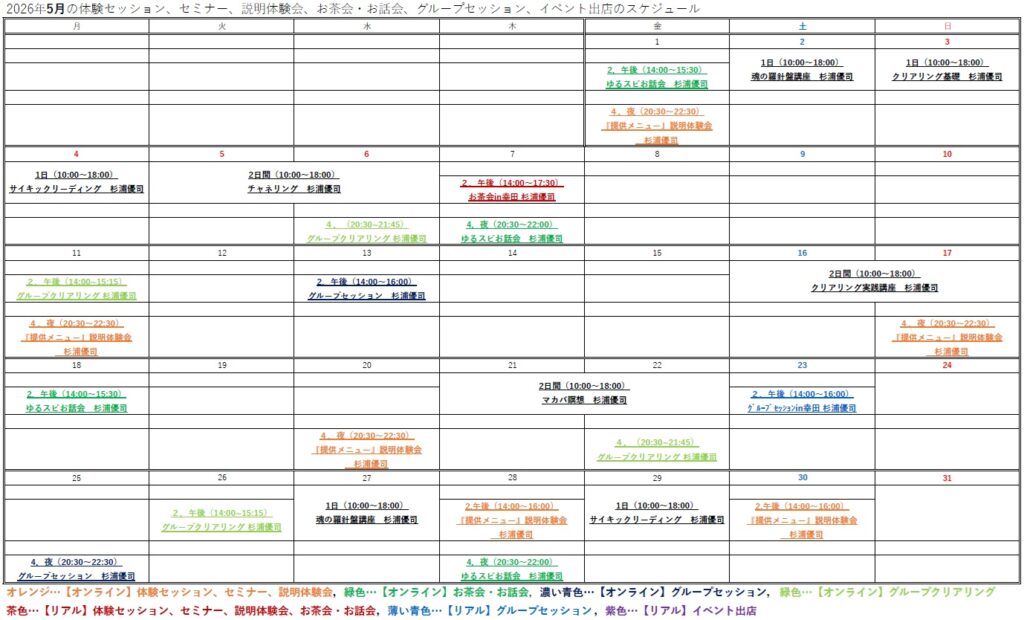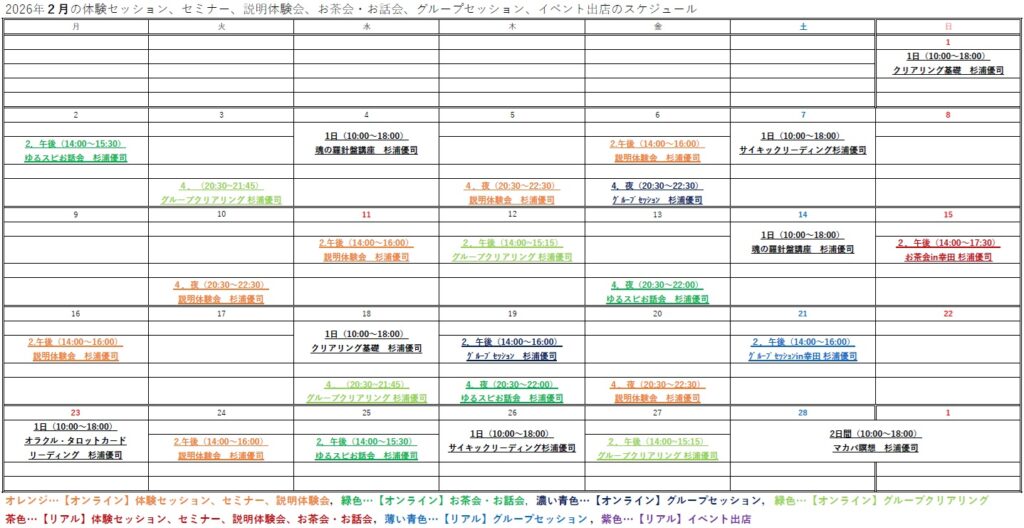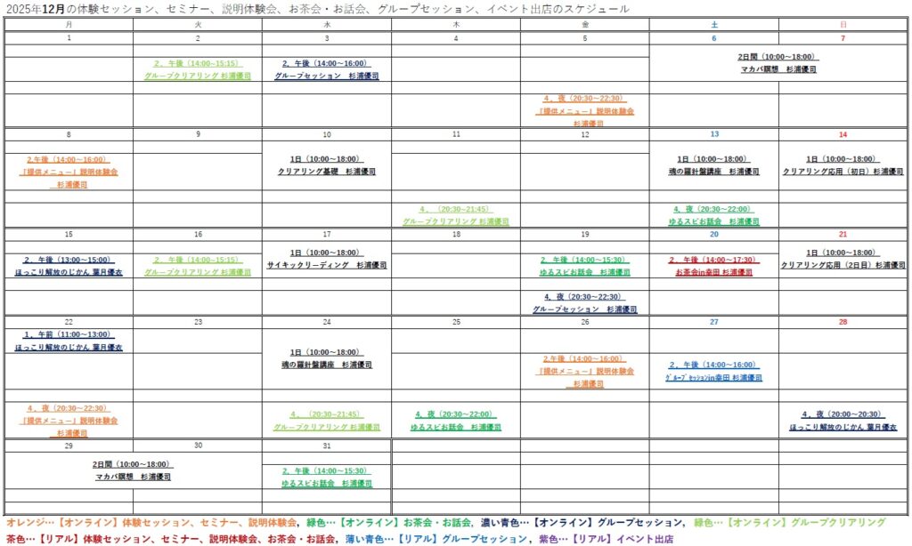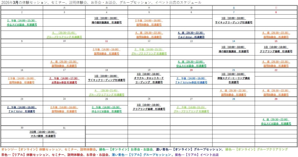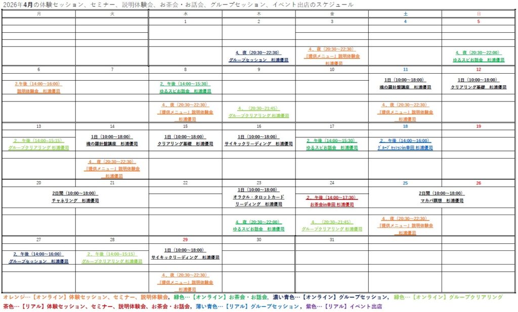 月別の体験セッション、セミナー&講座開催、説明体験会、お茶会・お話会、グループクリアリング&グループセッション、イベント出店のスケジュールの開催情報の確認と、申し込みができます。