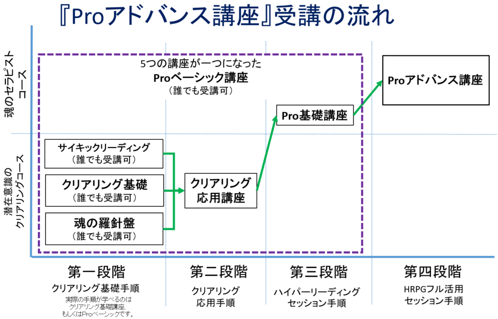 魂のセラピストコースでは、【潜在意識のクリアリングコース】のクリアリング応用講座受講後に習得できる『Pro基礎講座』か、【潜在意識のクリアリングコース】の5つの講座が一つになった『Proベーシック講座』から学ぶかのどちらかとなります。
